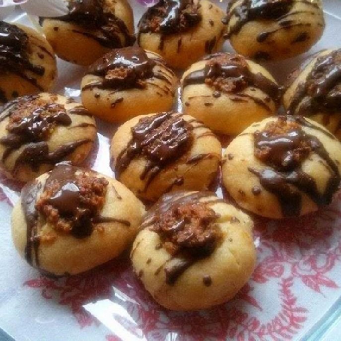 Elkészítés: a vajat a liszttel elmorzsoljuk, majd a porcukorral, a sóval és a vaníliás cukorral jól összegyúrjuk. A tésztát kb. 1 órára hűtőbe tesszük pihenni. Közben elkészítjük a tölteléket: a darált diót összekeverjük a cukorral és a lekvárral. A hűtőből kivesszük a tésztát, alaposan átgyúrjuk, és kb. egyforma golyókat formázunk belőle, majd sütőpapírral bélelt tepsibe sorakoztatjuk őket, de ne túl közel egymáshoz. Mélyedéseket nyomunk a golyókba, és kiskanál segítségével megtöltjük a töltelékkel. Előmelegített sütőben 170 fokon kb. 10-15 percig sütjük (ne süssük túl, mert akkor kemény lesz a tészta). Ekkor még nagyon puha a keksz, ezért óvatosan sütőpapírral együtt kell kiemelni. Utána mehet a következő adag. Amikor teljesen kihűltek a kekszek, gőz felett felolvasztjuk a csokoládét, és kanál segítségével csíkokat húzunk a tetejükre. (www.recepttar.hu)