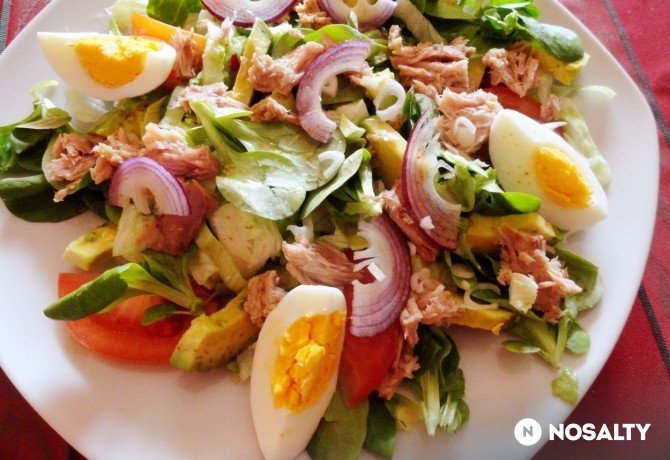 Elkészítés: a tojásokat fövő vízben kb. 10 perc alatt megfőzzük, hideg vízzel leöblítjük, hűlni hagyjuk. A chilit hosszában kettévágjuk, a magokat kiszedjük, és apró kockákra vágjuk. 3 ek citromlét sóval, borssal és cukorral ízesítjük, majd hozzákeverjük az olajat. A tojásokat meghántjuk, négybe vágjuk. A tonhalkonzerveket leszűrjük. A madársalátát megtisztítjuk, mossuk, saláta centrifugába megpörgetjük. A jégcsapsalátát megtisztítjuk, vékony csíkokra vágjuk. A paradicsomot megmossuk, vékony cikkekre vágjuk. Az avokádókat kettévágjuk, a magokat kiemeljük, a feleket még egyszer elfelezzük, a gyümölcshúst kiemeljük a héjból. A negyed avokádókat szeletekre vágjuk, és meglocsoljuk a maradék citromlével. A hagymát megtisztítjuk, vékony szeletekre vágjuk. A jégcsapsalátát, a madársalátát, tojást, tonhalat, paradicsomot, avokádót és a hagymát összekeverjük. Meglocsoljuk a vinaigrettel, és tányérokra osztjuk. (www.nosalty.hu)