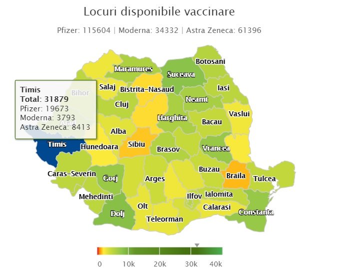 A legtöbb szabad hely Temes megyében van, közel 20 ezer a Pfizer, 3800 a Moderna és 8400 a AstraZeneca vakcinájára..