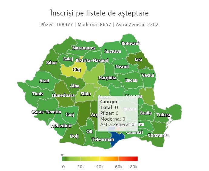 A legtöbben Bukarestben vannak feliratkozva a várólistákra, ott több mint 60 ezer személy vár a vakcina beadására, többségük a Pfizer oltóanyagára. A fővárosban csupán az AstraZeneca oltás esetében vannak szabad helyek, mintegy 5300.