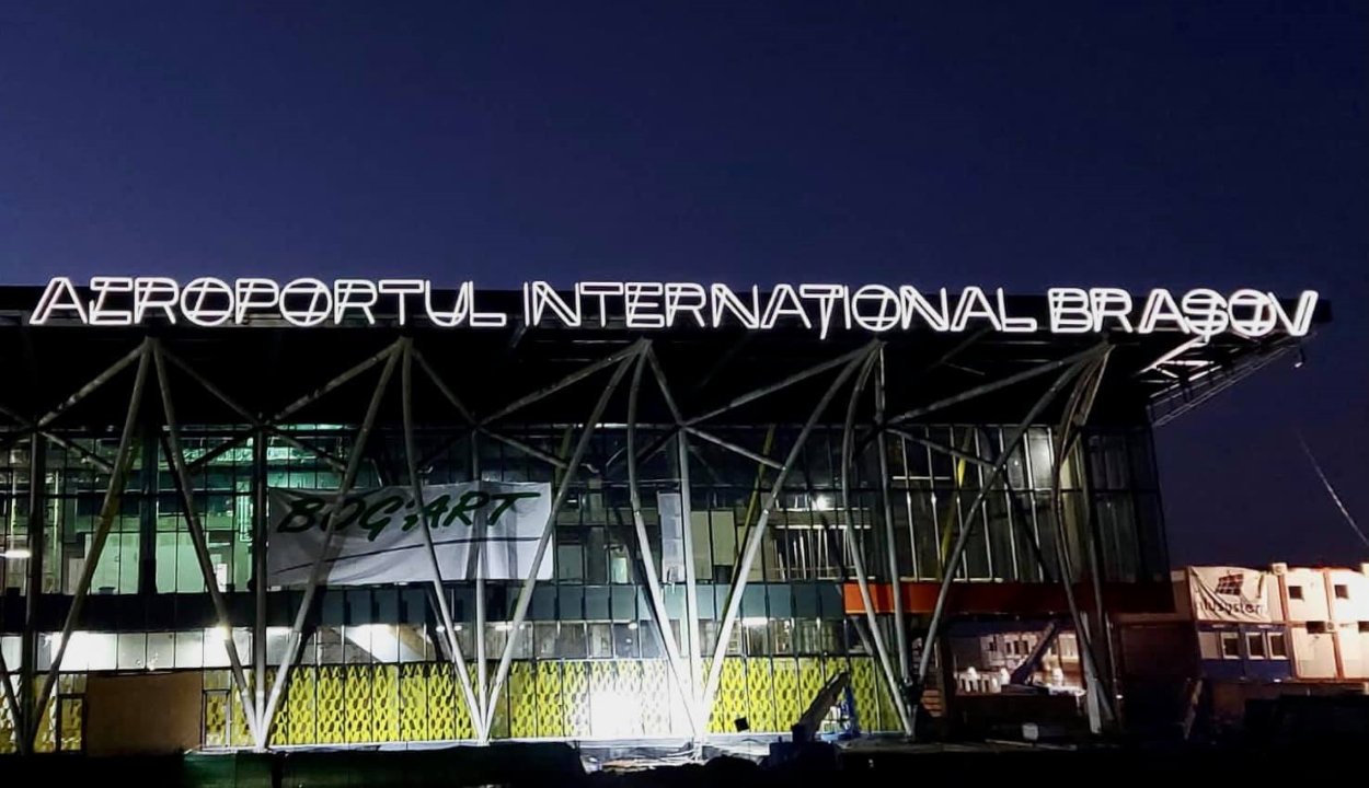Az "Aeroportul Internațional Brașov" elnevezés stilizált nyomtatott betűs formában készült, a világítótestek dupla-vonalas jelleget adnak a betűknek, ami ránézésre tetszetősnek mondható. A próbaüzemelés jól sikerült. A reptér hivatalos átadása 2021 márciusában esedékes. A szakértői becslések alapján első évben 114 ezer utasra lehet számítani, és az ügyfélforgalom egy évtizeden belül meghaladhatja az évi egymilliót.