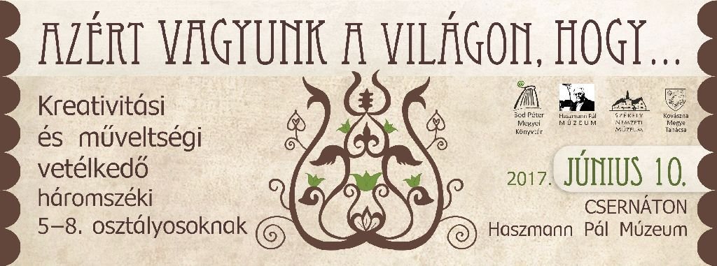 A csernátoni Haszmann Pál Múzeum és a Bod Péter Megyei Könyvtár kreativitási és műveltségi vetélkedőt szervez Azért vagyunk a világon, hogy... címmel háromszéki 5–8. osztályos diákoknak Tamási Áron (1897–1966) születése 120. évfordulója tiszteletére.