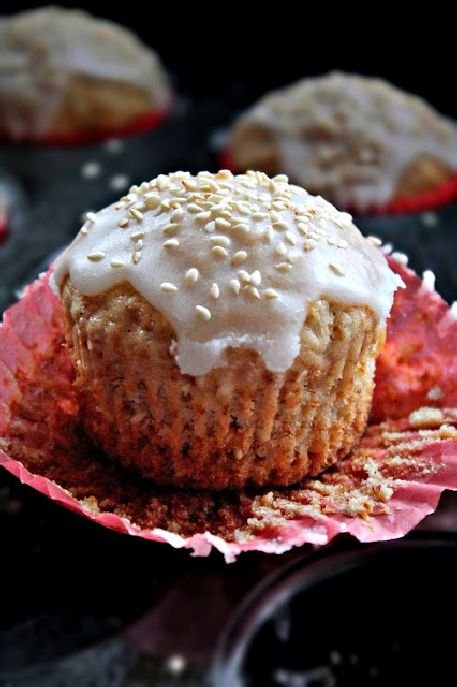 A szezámmagot egy serpenyőben kissé megpirítjuk. Óvatosan végezzük, állandóan kevergetve, és figyelve, mert ha túlpirítjuk, keserűvé válik. Akkor jó, ha kis színt kap, és az illatát intenzíven érezzük a serpenyő fölött. Előmelegítjük a sütőt 180 fokra. A muffinformába helyezzük a papírokat. A lisztet elkeverjük a sütőporral, szódabikarbónával, sóval. A puha, szobahőmérsékletű vajat kikeverjük a cukrokkal, majd a tojást is hozzákeverjük, aztán a vaníliaaromát, banánpépet, a pirított szezámmag 4/5-ét, a joghurtot is hozzáadjuk, jól elkeverjük. Végül összekeverjük a sütőporos, szódabikarbónás liszttel. Nem kell nagyon kikeverni, csak úgy lazán összedolgozni. Formába öntjük, és 15-20 percig sütjük. Amikor kihűlt, elkészítjük a cukormázat: 12 dkg porcukrot apránként elkeverünk 1-1,5 evőkanál rummal. Apránként adagoljuk, mert túl híggá válhat, éppen csak folyósnak kell lennie, akkor jó. Megcsorgatjuk vele a muffinok tetejét, megszórjuk a kihagyott kevéske szezámmaggal. (http://szellemafazekban.blogspot.ro)
