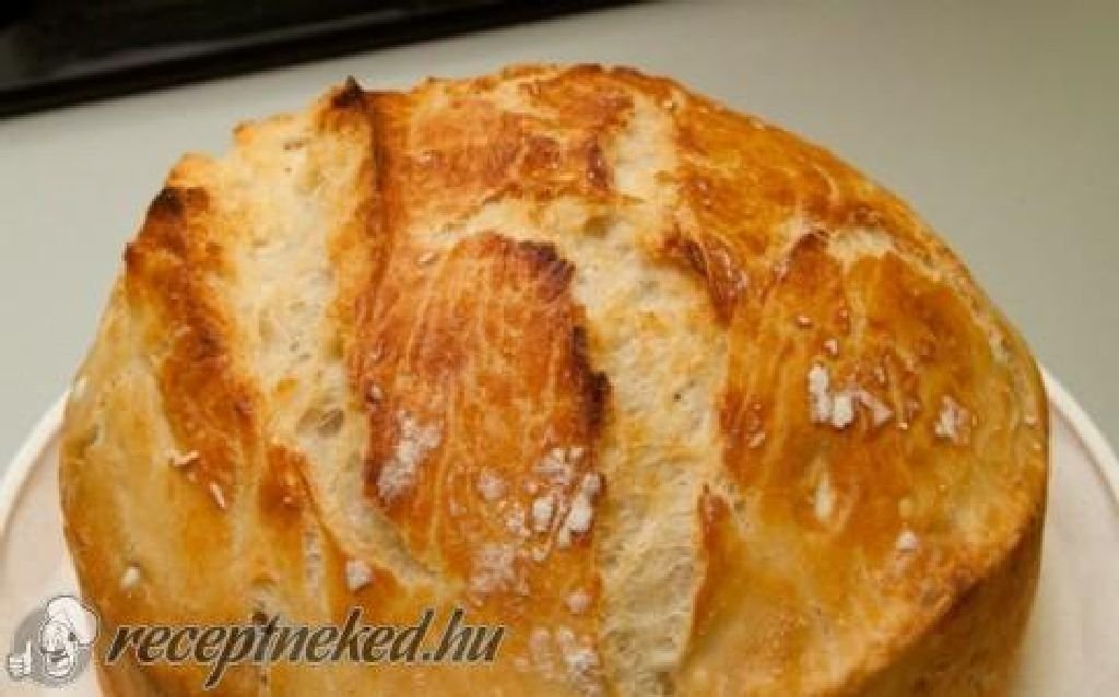 Elkészítése: a száraz hozzávalókat összekeverjük, majd hozzáadjuk a vizet, mindezt jól elkeverjük (inkább lágy ragadós, mintsem gyúrható tésztát kapunk), majd 12 órát pihenni hagyjuk. Lisztezett lapítóra kiborítjuk, majd lisztezett kézzel a széleitől meghajtogatjuk és pihenni hagyjuk, amíg a sütő bemelegszik. A sütőt és az edényt (ez lehet jénai vagy bármilyen más, minek födele van) bemelegítjük, majd egy kis vajat teszünk az edény aljára és körbeforgatjuk, míg szétolvad, beleemeljük a tésztát és kb. 45 percig fedő alatt sütjük, majd még 5-10 percig fedő nélkül. (www.receptneked.hu)
