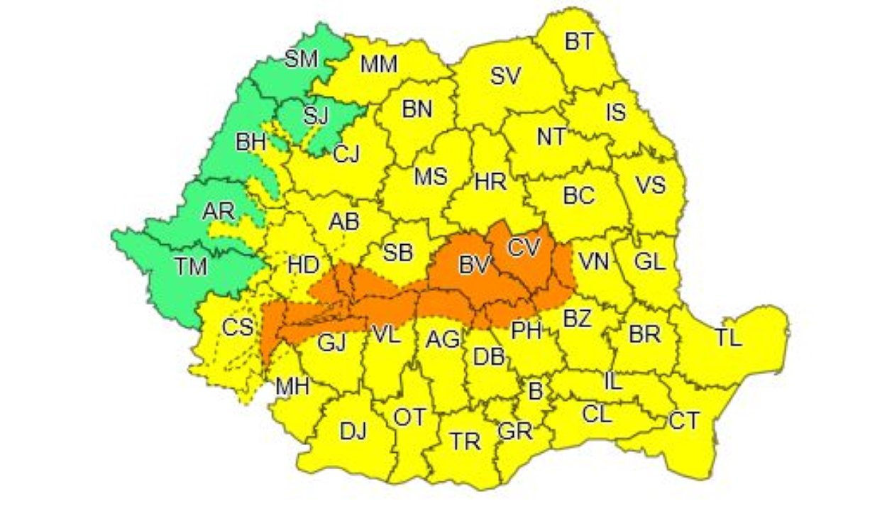 A narancssárga jelzésű riasztás Kovászna, Vrancea, Buzău, Brassó, Prahova, Argeş, Szeben, Vâlcea, Fehér, Hunyad, Gorj és Krassó-Szörény megyében érvényes.