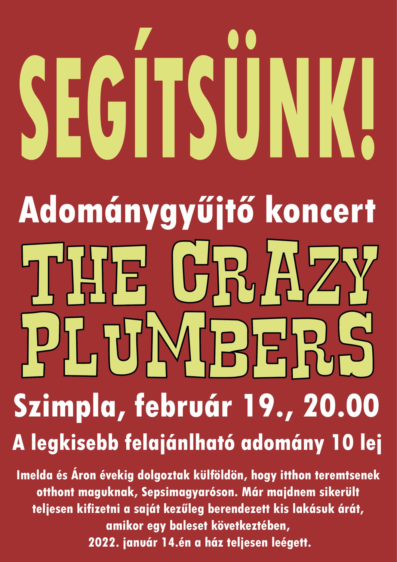 Hogyha önmagában nem lenne elég az, hogy az utóbbi ínséges évek után végre élő koncertre mehetünk, ráadásként egy bajba jutott fiatal páron segíthetünk azzal, ha szombaton, február 19-én bulizunk a The Crazy Plumbersszel.