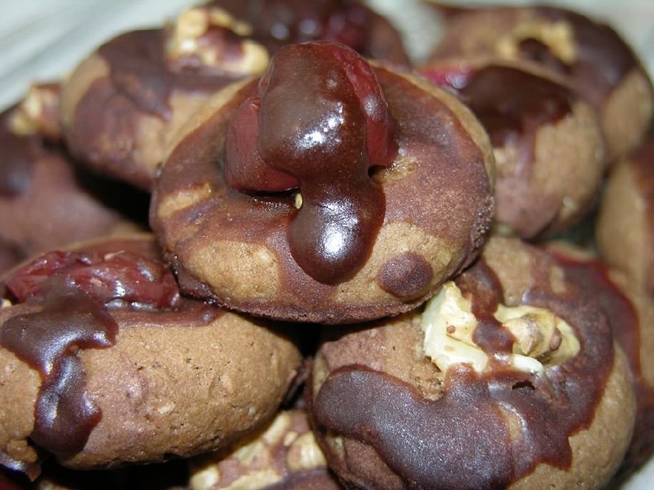És most következik az, ami miatt tulajdonképpen nekifogtam a sütésnek. Tudniillik a nyáron szeszben eltett meggyemről a szesz elillant, valamit kellett kezdeni a gyümölccsel. Hát ezekben a mélyedésekben végezte (épp ezért gyermeki gyomroknak nemigen ajánlom!). Végezetül, díszítés céljából csokiöntetet is kapott.