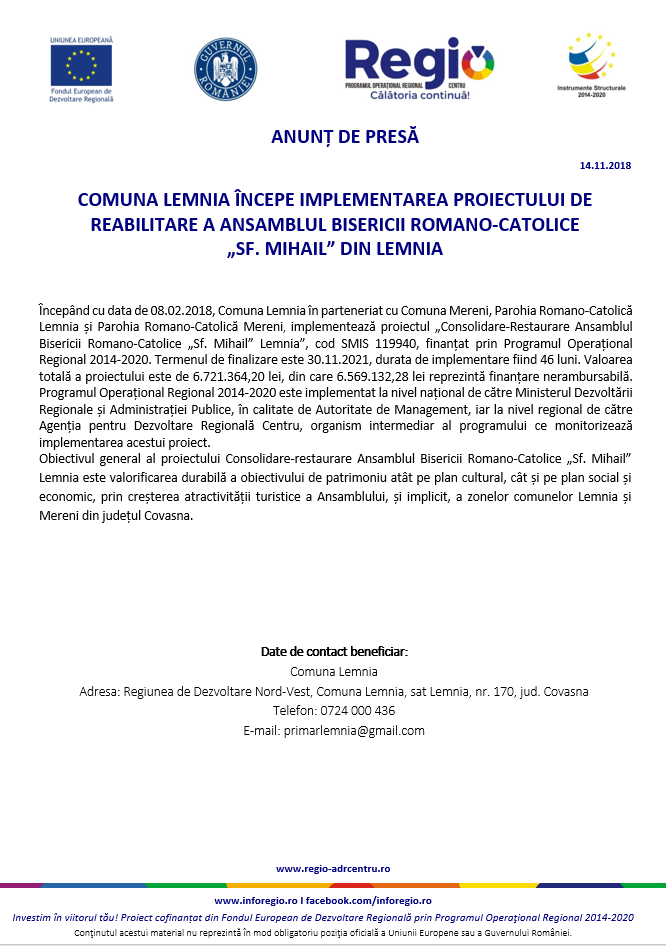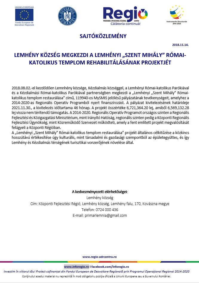 2018.08.02.-el kezdődően Lemnhény községe, Kézdialmás községgel, a Lemhényi Római-katolikus Parókiával és a Kézdialmási Római-katolikus Parókiával partnerségben megkezdi a „Lemhényi „Szent Mihály” Római-katolikus templom restaurálása” című, 119940-os MySMIS jelölésű pályázatának tevékenységeit, amelyhez a 2014-2020-as Regionális Operatív Programból nyert finanszírozást. A pályázat kivitelezésének határideje 2021.11.30., a kivitelezés időtartama 46 hónap. A projekt összértéke 6,721,364.20 lej, amiből 6,569,132.28 lej vissza nem térítendő támogatás. A 2014-2020. Regionális Operatív Programot országos szinten a Regionális Fejlesztési és Közigazgatási Minisztérium, mint Irányító Hatóság, regionális szinten pedig a Központi Regionális Fejlesztési Ügynökség, mint Közreműködő Szervezet működteti, amely a fent említett projekt megvalósítását felügyeli a Központi Régióban.