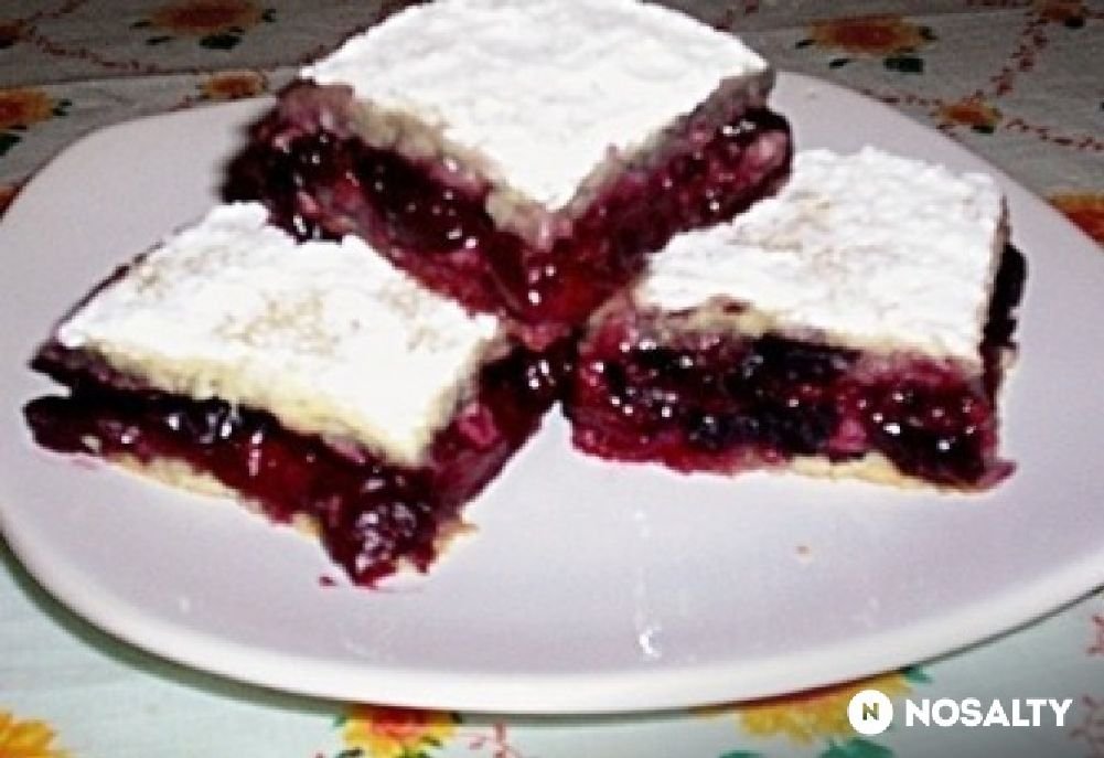A lisztet, cukrot, szódabikarbónát és a sót tálba tesszük, összemorzsoljuk a zsírral. Beletesszük a tojást, a tejfölt, és rugalmas tésztát készítünk. Ha nem áll össze, kevés tejet adunk hozzá. Kizsírozzuk a tepsit. A tésztát kétfelé vesszük, és az egyik felét 1 cm vastagra nyújtjuk, majd beletesszük tepsibe. Ráterítjük a kimagozott és lecsepegtetett cseresznyét. Megszórjuk kevés búzadarával, meghintjük fahéjjal. Ízlés szerint megcukrozzuk. Kinyújtjuk a tészta másik felét, és betakarjuk vele a gyümölcsöt. Villával megszurkáljuk, hogy meg ne repedjen. Begyújtjuk a sütőt, és kb. 40 perc alatt megsütjük. Forrón meghintjük porcukorral a tetejét ,és még melegen kockákra vágjuk, mert ha kihűl, törik a tészta. (www.nosalty.hu)