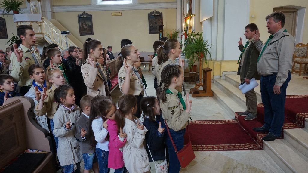 A sorban tizenkilencedik falunapra enyhén rányomta a bélyegét az időjárás, imitt-amott esőben zajlott a rendezvény. Emiatt a vasárnapi nagymise után a cserkészavató ünnepség is a templomban történt. Itt tartotta – a falunapok eddigi története során először – köszöntőbeszédét Cseh József polgármester is, üdvözölve nemcsak a helyieket, hanem a testvértelepülésekről érkező küldöttségeket is. A Bereczi István római katolikus plébános által celebrált szentmise után Ilyés Botond alpolgármester, a 141-es számú Nagyboldogasszony Cserkészcsapat parancsnoka vezetésével lezajlott ceremónián hat kiscserkészt fogadtak be a csapatba, illetve a társaik újították meg fogadalmukat.