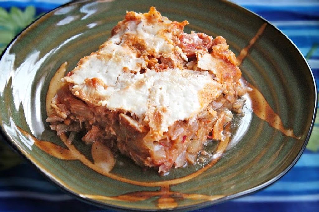 A húst csíkokra vágtam és a zsiradékon sóval, borssal és az egész köménnyel átpirítottam, majd hozzáadtam a fél karikákra vágott hagymát, zöldpaprikát, az apróra vágott fokhagymát. A hagyma üvegesedéséig sütöttem, majd fűszereztem a paprikakrémmel, és felöntöttem kevés vízzel. Fedő alatt, többször alávizezve, keverve a húst puhulásig főztem. Közben laskára vágtam a káposztát, és sós, majoránnás vízben puhára főztem. A levét végül leöntöttem róla, úgy hagytam hűlni. Lehéjaztam a paradicsomot, kis kockákra vágtam. Amikor puha volt a hús, hozzáadtam a sűrített paradicsomot is, és a karikákra vágott kolbászt is. Hagytam egyet rottyanni, s lezártam alatta a lángot. Összevegyítettem a káposztát a szaftos hússal, és kizsírozott tepsibe tettem. A tetejét meglocsoltam a tejföllel, és 30 percig, a tejföl barnulásáig sütöttem cirka 180 fokon. (http://szellemafazekban.blogspot.ro)