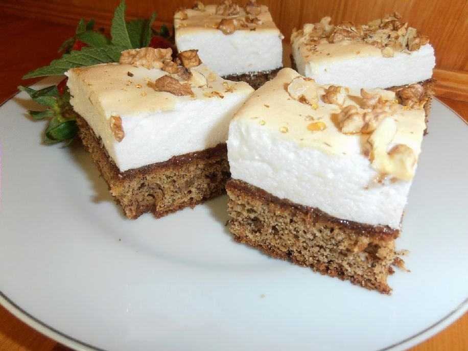 Így készült: a tojássárgájákat a cukorral elkevertem, majd hozzáadtam a citromhéjat, s a tejjel váltakozva a sütőporral elkevert lisztet és a diót. Alaposan elkevertem. Kikent tepsibe simítottam a masszát, 180 fokon majdnem készre sütöttem. Közben a tojások fehérjét a cukorral kemény habbá vertem. A majdnem kész tésztát lekentem a lekvárral, elsimítottam rajta a habot, beszórtam a darabolt dióval, s visszavéve kissé a hőfokot, addig tartottam még a sütőben, míg a hab kissé megpirult. Kihűlés után szeleteltem. A lekvárt nem kell sajnálni róla, vastagon kentem meg. Finom benne a savanykás lekvár, a lap szárazságát is enyhíti. (www.gerdisuti.blogspot.ro)