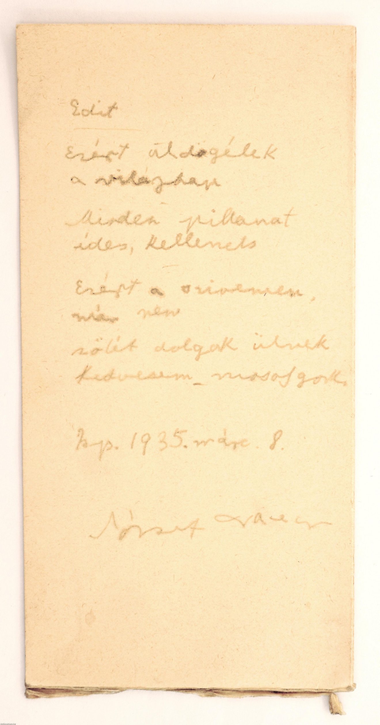 Egy négy lapból álló, iskolai füzetnél picivel kisebb notesz, vagyis notesztöredék első lapján József Attila kézírásával egy nyolcsoros vers, alatta dátum (Bp. 1935. március 8.) és aláírás, a többi három lap üres (leszámítva egy ceruzával írt nevet: Barta István). A vers címe Edit, a szöveg látszólag banális: