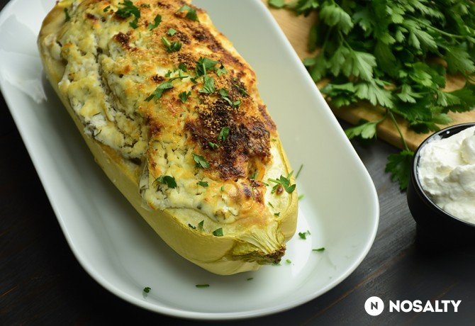 Elkészítés: a tököt félbevágjuk, kimagozzuk, húsát kicsit kivájjuk kanállal. Az olívaolajat felmelegítjük, és megfuttatjuk rajta a vöröshagymát és a fokhagymát, míg kicsit elveszítik a nyersségüket. A darált húst, a megpárolt hagymákat, a fűszerpaprikát, sót, borsot, a főtt rizst, a csokor kapor felét apróra vágva, a két tojással együtt egy tálba öntjük, és alaposan összekeverjük. Beletöltjük a kivájt tökbe. A tejfölt összekeverjük a kapor másik felével, majd rákenjük a töltelékre. Megszórjuk a zsemlemorzsával, aláöntjük az egy deci vizet, és 180 fokra előmelegített sütőbe dugjuk. 50 perc alatt készre sütjük, Ha szükséges, félidőben letakarjuk alufóliával. (www.nosalty.hu)