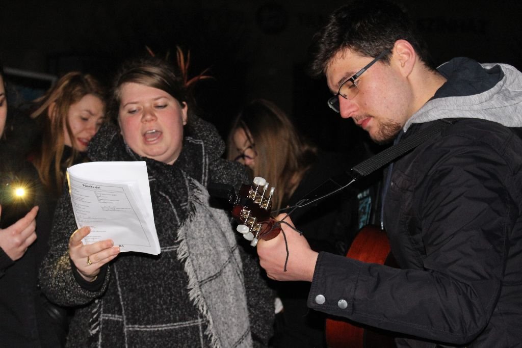 Gyertyák és mobiltelefonok világították meg a megyeszékhely főterét szombat este. Bár a megfelelő gitárakkord lefogása a fagypont alatti hőmérsékletben nem mindig ment simán, az eredmény kielégítő volt, hisz olyan népszerű dalokat, mint a Gyöngyhajú lány, a 67-es úton, vagy az Andri Popa és a Hotel Cişmigiura „adaptált” Hotel California, nyilvánvaló módon nem először énekelt ez a társaság.