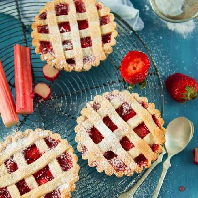 Elkészítés: a tésztához a lisztet elmorzsoljuk a vajjal, a porcukorral és a vanília kikapart magjaival. Hozzáadjuk a tojássárgáját, majd gyors mozdulatokkal összegyúrjuk, fóliába csomagoljuk, és a hűtőbe tesszük 1-2 órára. A töltelékhez egy serpenyőbe tesszük a feldarabolt rebarbarát, a cukrot és a citromlevet. Alacsony lángon felforraljuk. A tésztát 7 egyenlő részre osztjuk (süthetünk egy nagy pitét is ebből a mennyiségből), majd enyhén lisztezett felületen kinyújtjuk őket. Előveszünk 6 mini tortaformát, kikenjük vajjal, majd mindegyikbe 1-1 tésztakorongot nyomkodunk. Ezután villával megszurkáljuk a tészták alját, majd kanalazunk bele a kihűlt rebarbarából, és friss epret szeletelünk rá. Az egy megmaradt tésztalapunkat vékony csíkokra vágjuk, és berácsozzuk vele a piték tetejét. A pitéket 200 fokra előmelegített sütőbe toljuk kb. 30 percre. Ha kihűlt, megszórjuk kevés porcukorral, és tálaljuk. (www.mindmegette.hu)