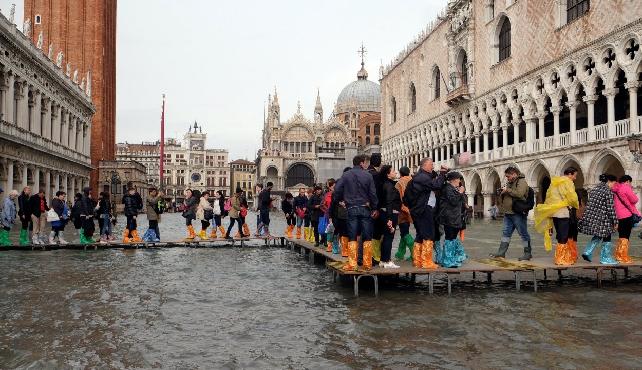Velencében kedden 156 centiméteres vízállást mértek, ami szokatlanul magasnak számít. Több mint 80 év alatt mindössze ötször fordult elő korábban, hogy a vízszint átlépte a 150 centiméteres küszöböt.