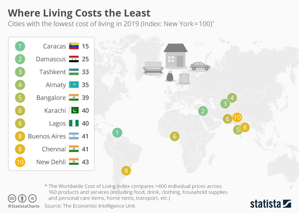 A fent vizsgált európai városok egyike sem esett bele a legolcsóbb városok körébe, míg a venezuelai Caracas, a szíriai Damaszkusz és az üzbegisztáni Taskent vagy az indiai Bangalore viszont igen.