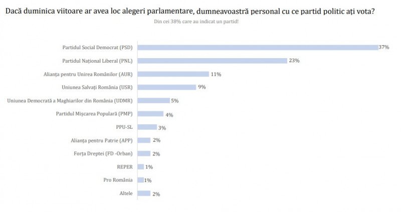 Ha jövő vasárnap tartanák a parlamenti választásokat, a szavati joggal rendelkezők többsége a PSD-re szavazna. A szociáldemokraták 37 százalékot, míg a nemzeti liberálisok 23 százalékot kapnának. A PNL-t az AUR követi 11%-kal és az USR 9%-kal. A felmérés szerint az RMDSZ elérné az 5 százalékos bejutaási küszöböt.