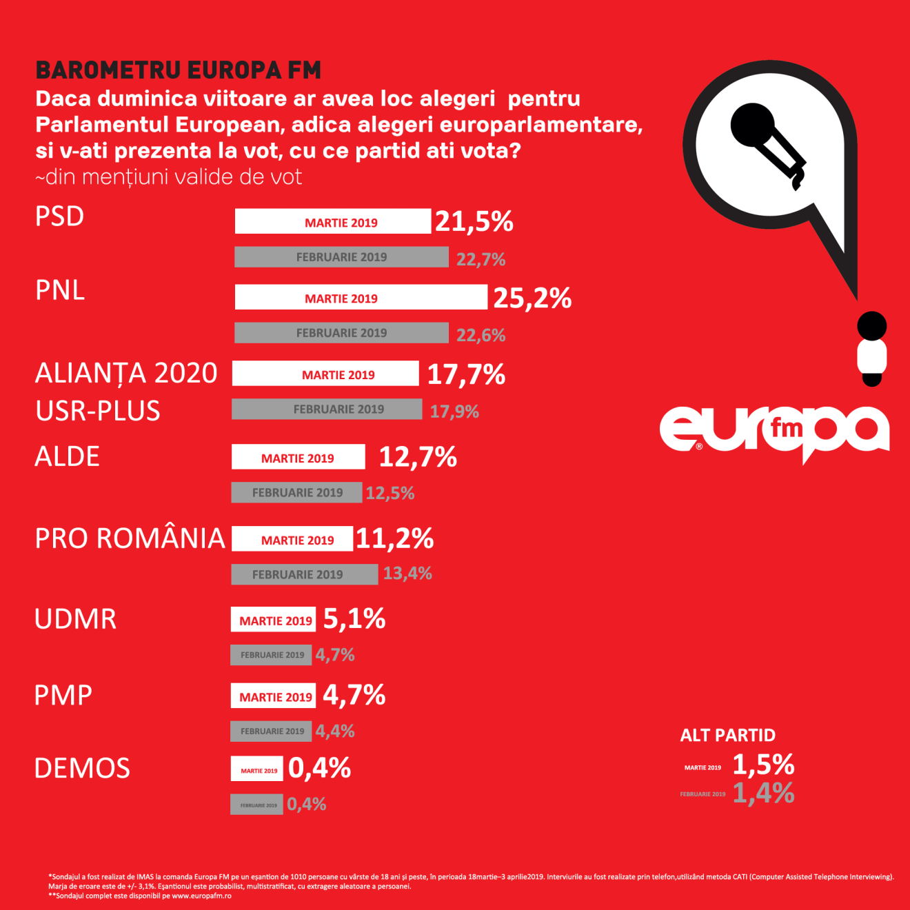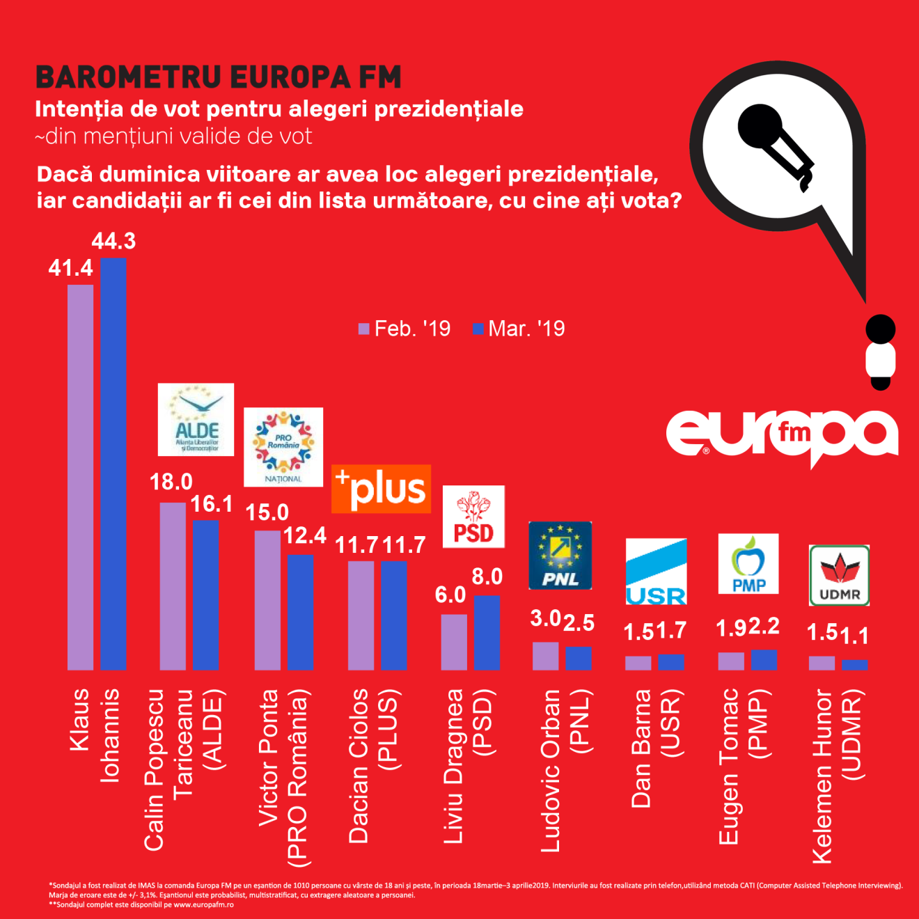 A közvélemény-kutatás az Europa FM rádióállomás megrendelésére készült a március 18 - április 3 közötti időszakban, 1010 szavazati joggal rendelkező (18 éven felüli) személy telefonos megkérdezésével. A hibahatár +/- 3,1%.