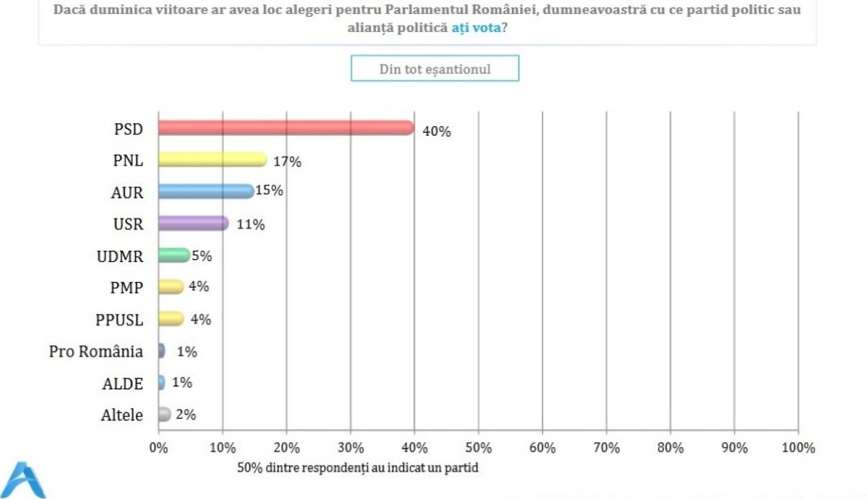 Ha a jövő hétvégén tartanák a parlamenti választásokat, a PSD 40%-ot, a PNL 17%-ot, az AUR 15%-ot, az USR 11%-ot kapna - derül ki az Avangarde közvélemény-kutatásából, amely a PSD megrendelésére készült novemberben.