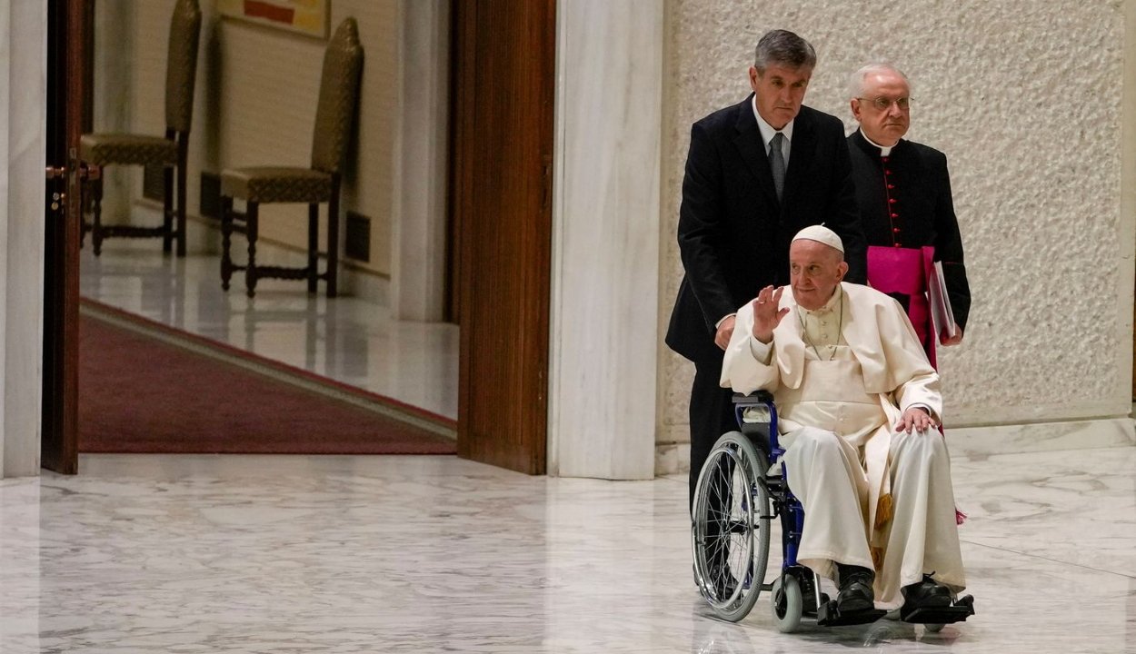 Első alkalommal érkezett kerekesszéken egy találkozóra Ferenc pápa, akit kiújult térdfájása miatt orvosai tanácsoltak el a gyaloglástól.