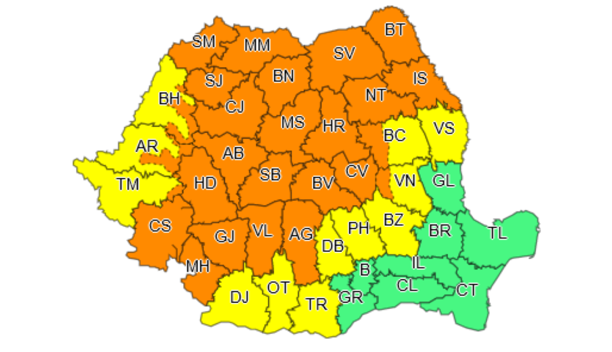 Másodfokú viharriadó van érvényben szerda délután 2 órától csütörtök reggel 6 óráig Erdélyben, Máramarosban, Moldva északi felében, a hegyvidéken, a Bánság déli részében, Olténia északi és Munténia északnyugati részében. Az érintett megyék a következők: Fehér, Argeş, Arad, Bákó, Bihar, Beszterce-Naszód, Botoşani, Brassó, Kolozs, Krassó-Szörény, Kovászna, Gorj, Hunyad, Hargita, Iaşi, Mehedinţi, Máramaros, Maros, Neamţ, Szeben, Szilágy, Szatmár, Suceava, Temes, Vâlcea és Vrancea.