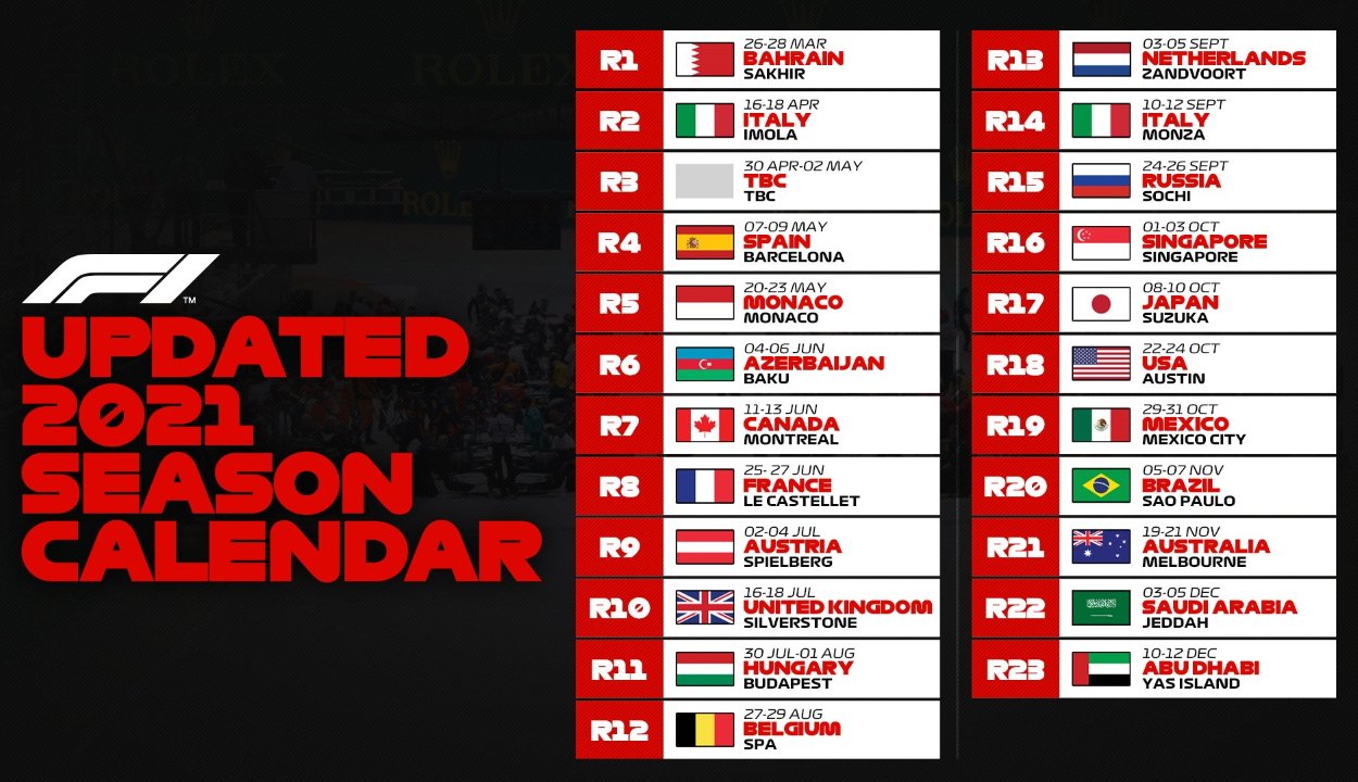 A Formula–1 vezetősége bejelentette, hogy az eredeti tervekkel ellentétben nem Ausztráliában, hanem Bahreinben veszi kezdetét a 2021-es idény, továbbá megerősítette, hogy Imola az idén is vendégül látja a mezőnyt.