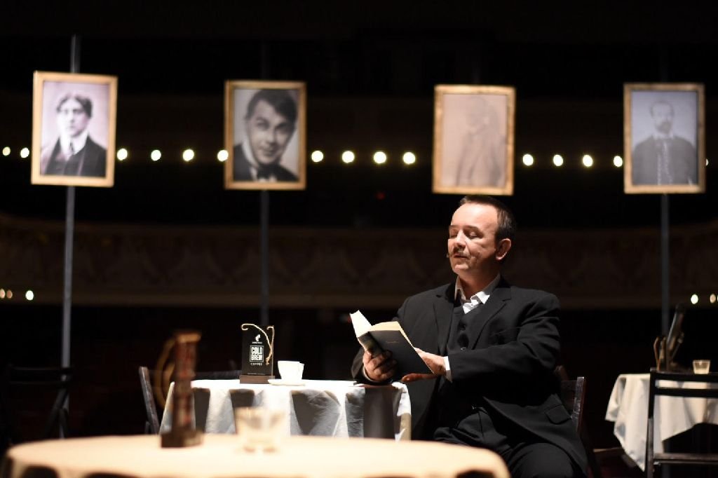 Egyre népszerűbbek a kocsmaszínházi előadások, de az ritkán fordul elő, hogy egy előadás kedvéért a színház változzon át kávéházzá, ahol friss feketét szolgálnak fel a közönségnek. Hogy miért kávéház? Mert Karinthy ott érezte igazán elemében magát, ez volt az a helyszín, ahol a Nyugat írói köre egykor élénk vitákat folytatott egymással, de ahol általában kicsit vidámabban, játékosabban volt jelen az irodalom, mint a hivatalos helyeken. A stílusparódiák vagy irodalmi karikatúrák – ahogy maga Karinthy nevezte írásait – az eredeti művek mellett hallhatóak az előadásban, Kiss László nagyszerű érzékkel, szellemesen és rendkívüli művészi alázattal idézi meg a színpadon a magyar irodalom közismert alkotóit.