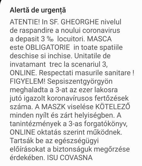 Erről küldött figyelmeztetést a lakosságnak a belügyminisztérium, a RO-ALERT rendszeren keresztül. Ennek következményeként mostantól kötelező a maszkviselés minden zárt és nyílt térben, valamint az oktatás a hármas, vörös forgatókönyv szerint zajlik, kizárólag online.