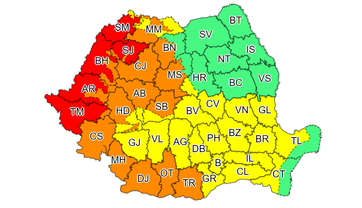 A figyelmeztetés az ország délkeleti részén sárga, Erdélyben és Moldvában narancssárga kódjelzésű.