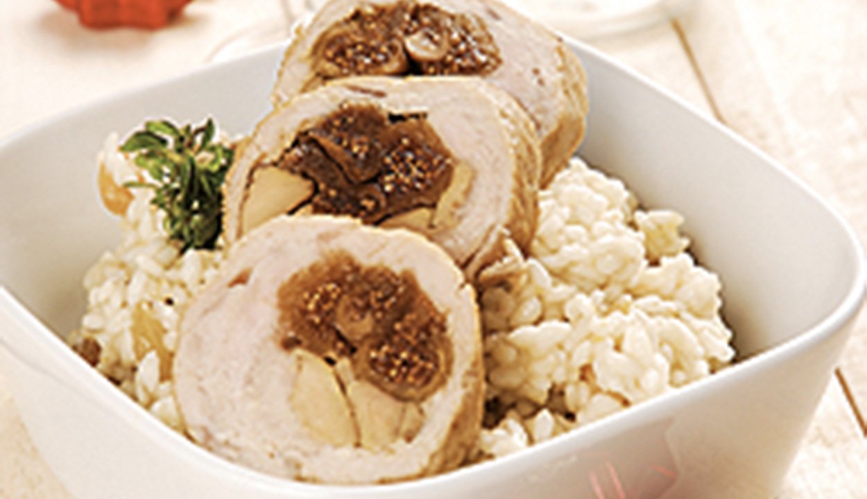 Elkészítés: a májból 4 szeletet vágunk, majd a szeleteket ujjnyi vastag csíkokra szeljük, sózzuk, majoránnával megszórjuk. Serpenyőben néhány csepp olajon, közepes lángon elősütjük minden oldalán, ügyelve arra, hogy ne égjen meg. Hagyjuk, hogy egy kicsit kihűljön. Az aszalt fügét enyhén cukros vízben 3 percig forraljuk, levesszük a tűzről, hagyjuk a főzőlében kihűlni. A pulykamellből négy darab 20 dkg-os szeletet vágunk, kiklopfoljuk, besózzuk, majd a májat és a félbevágott fügéket egyenlően elosztjuk egy csíkban a közepén. A pulykamell széleit behajtjuk, feltekerjük. A tekercset olajozott alufóliába tekerjük, és serpenyőben kevés olajon minden oldalán elősütjük (alufóliástul!), majd tepsibe tesszük, és 190 fokos sütőben 12 percig sütjük. Közben vajat és kevés olajat melegítünk egy lábosban, beletesszük a rizst, kicsit üvegesítjük, hozzáadjuk a fehérbort, 1 dl vizet, sót, majd amikor elfő a víz, 1-1 merőkanálnyival mindig pótoljuk. Összesen kb. 1 liter víz szükséges ennyi rizshez. Félidőben hozzáadjuk a mazsolát, készre főzzük. A roládot felszeleteljük, és a rizottóval tálaljuk. (www.nlcafe.hu)