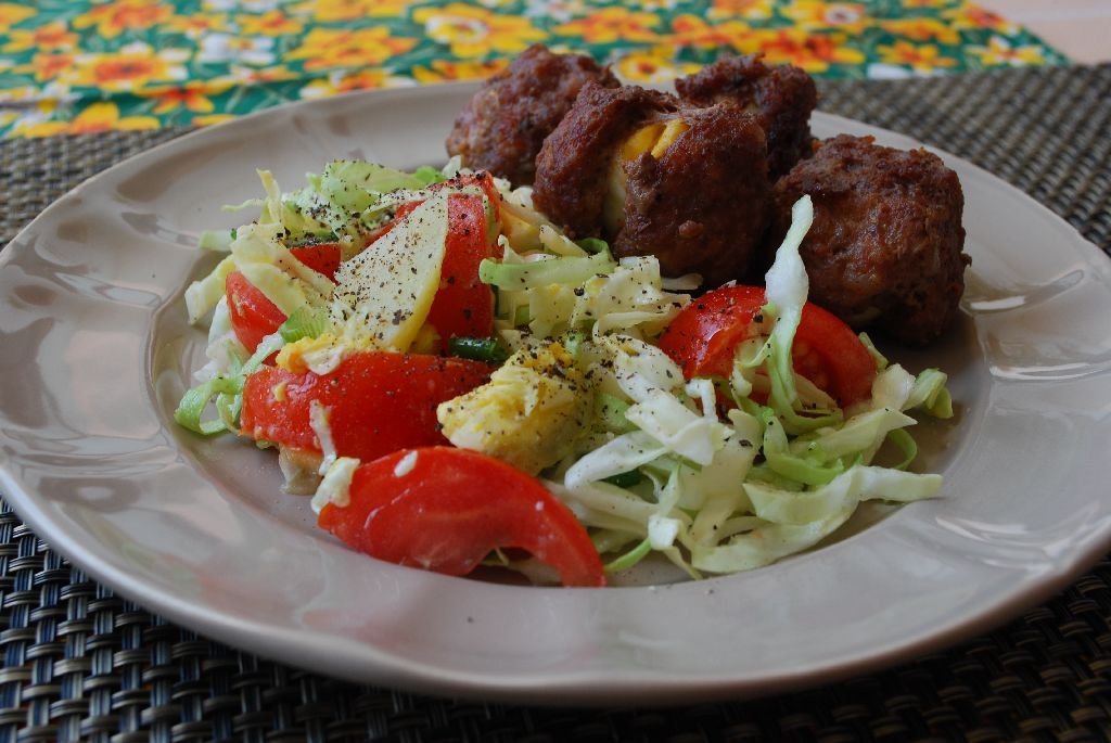 Egy nagy kedvenc nálunk a fürjtojással töltött fasírt, a Stefánia-szelet kishúga. A keményre főzött tojást darált húsba (tojás, zsemle, fokhagyma, só, bors) csomagolva, forró olajban kisütöm. E nyárias, áprilisban friss zöldségekből készült salátával tálaltam.