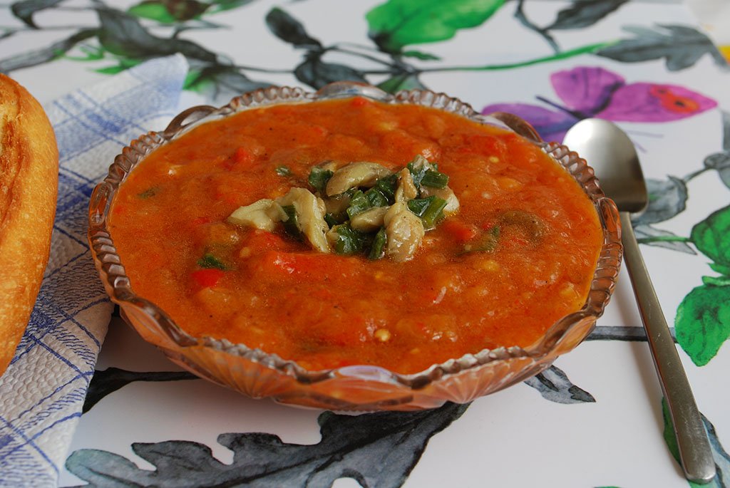 Egy szó, mint száz, kertileg adott volt a hagyma, a cukkini, a murok, és néhány zsenge paszulyszem, erdeileg a hirip. Vásároltam paprikát, paradicsomot, vinettát, majd indulhatott is a projekt: vinettasütéssel. Lerben, mivel a frissen gyártott parazsamat egy futva érkező, de minálunk hosszas pihenőt tartó zápor, sebtiben kioltotta. Ha meg már amúgy is minden zakuszkai törvényt készültem áthágni, a zöldségeket apró kockára vágva főztem, só, bors és babérlevél társaságában. Az állagon utólag is lehet változtatni, egy botmixer segítségével. Legvégül társult az apróra szecskált vinetta. A végeredmény egy néhol piciny darabokat rejtő, a kenyérre krémesen simuló, igazán finom zöldséges eledel lett. Csak türelem kérdése az egész (minden alapanyag önmaga súlyánál kétszerannyi folyadékot eregetett), és ínycsiklandó, nyárias ízeket kóstolgathatunk.