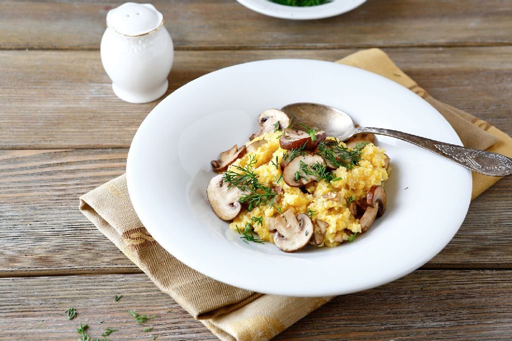 Hozzávalók: 6 dl tej, 1 csipet szerecsendió, 1 púpozott tk kurkuma (elhagyható), só, frissen őrölt bors, 40 dkg kukoricaliszt, 1 dkg szárított vargánya, 50 dkg friss gomba, 3 salotta, 2 gerezd fokhagyma, 3 ek olívaolaj, 2 ek balzsamecet, 2 ek sherry, 1,5 dl habtejszín, 1/2 marék petrezselyem, 1 ek rozmaringlevél, 15 dkg mozzarella.