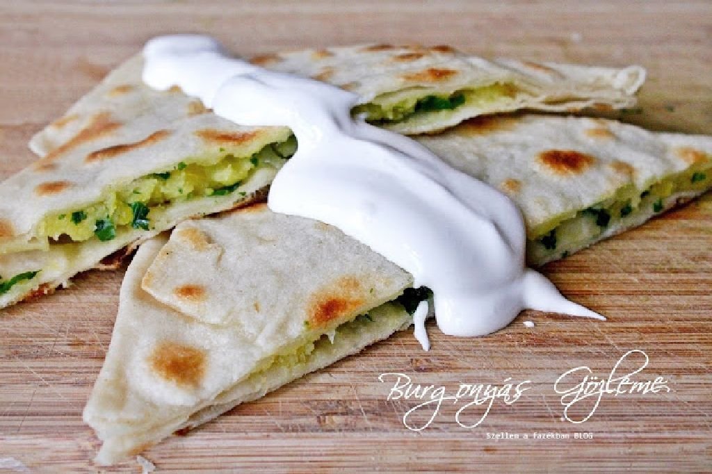 A lisztből, vízből, élesztőből szép sima tésztát dagasztunk. Letakarjuk, hagyjuk duplájára kelni. Közben megfőzzük a hámozott, kockázott burgonyát sós vízben, leszűrjük. Egy kis lábosban az olajon megdinszteljük kevés sóval az apróra kockázott vöröshagymát, majd a főtt burgonyához adjuk, és villával a krumplit össze is törjük. Mikor már csak langyos a töltelék, az apróra vágott medvehagymát is hozzákeverjük. Ha megkelt a tészta, nyolc gombócra formázzuk. Letakarva hagyjuk 10-15 percet állni, majd egyesével lisztezett deszkán vagy a konyhapulton kinyújtjuk. Megtöltjük, hajtogatjuk, s a közben felmelegített serpenyőbe tesszük. Közepes lángon süssük, hogy kellően átsüljön. Mielőtt megfordítanánk, a tetejét megkenjük olvasztott vajjal, s mielőtt kivennénk a serpenyőből, ismét megfordítjuk, és a másik felét is megkenjük. Sorban nyújtjuk és sütjük. (http://szellemafazekban.blogspot.ro)