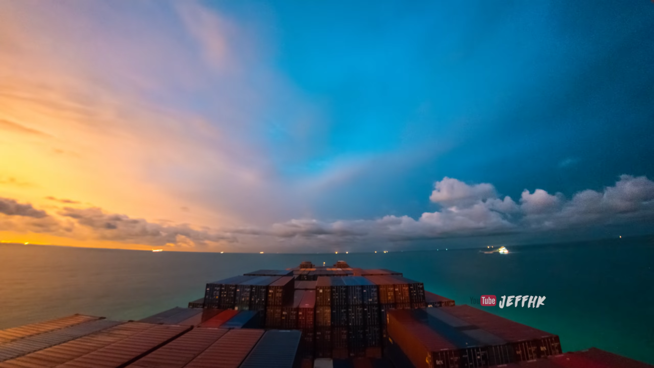 Egy JeffHK nevű YouTuber harminc napon át folyamatosan rögzítette, hogy mi történik egy teherhajó fedélzetén, és hogy miként telnek az egyáltalán nem egyhangú napok az óceánon. A kamerát akkor is bekapcsolva hagyta, amikor aludni ment. A felvételekből egy tízperces time lapse videó született, ezen láthatjuk, hogyan rakodják le és fel a konténereket a hajón Srí Lankán vagy egy szingapúri kikötőben, milyen ijesztő egy vihar az Indiai-óceánon a vaksötétben, micsoda látvány belevezetni a hajót a naplementébe, és hogy semmihez sem fogható az a csillagos égbolt, ami tiszta időben ráborul a horizontra.
