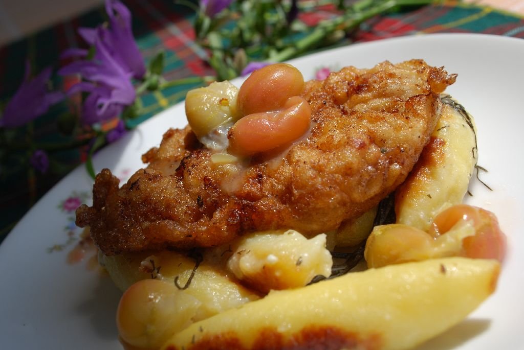 Mai ebédünk is a víz jegyében készült, pontosabban a vízből érkezett, ezúttal ugyan még áruházi összekötő segítségével, de igen gondolkodom (mióta éghajlatunk egyre inkább mérsékelt égövi monszunos lett), hogy halastavat, ne adj’isten, rizsültetvényt telepítek a kertbe. A hal bundába került (tekintetbe vévén az alacsony hőfokokat), a krumpliból nokedli lett, majd mindnyájan kapros mártásba burkolózhattak. A nokedlit főtt, hidegen áttört (kevesebb lisztet vesz fel) krumpliból készítem: 1,5 kg krumpli, 500 g liszt, 1 tojás, 1 csipet só arányban. Az összegyúrt masszából kis kukacokat hengergetek, melyek némi forróvizes fürdő után kész nudli alakot öltenek.