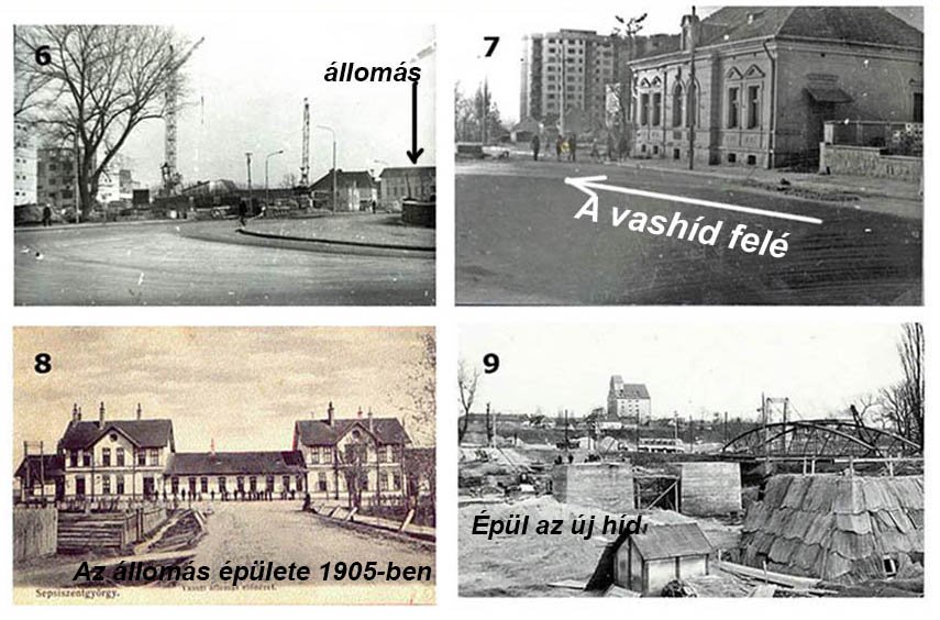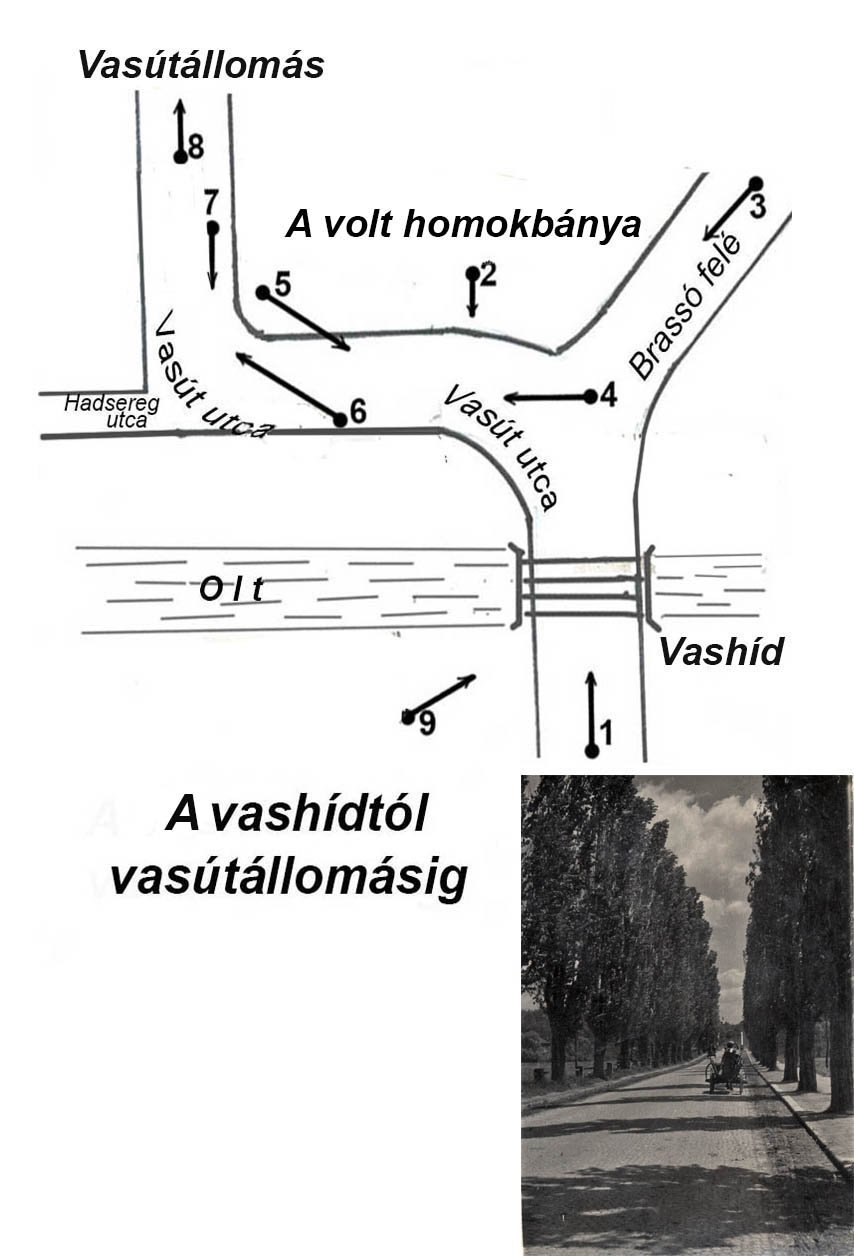 A 2. számú térképvázlaton a 3. és 4. montázson látható nyolc fénykép készítési helyét és a jegenyesor képét tüntettük fel. A nyilak az exponálás irányát jelzik. A behatóbban érdeklődő olvasót szeretnénk ezzel hozzásegíteni, hogy képzeletében kialakítsa a híd és a vasútállomás közötti városrész egykori képét.