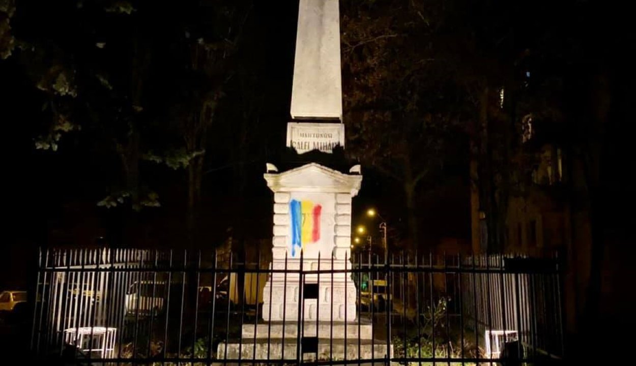 Az RMDSZ által közölt fényképen az látszik, hogy az 1854-ben Habsburg-ellenes felkelés szítása miatt kivégzett székely vértanúk vesztőhelyén állított obeliszk egyik oldalára a román nemzeti színeket festették fel.