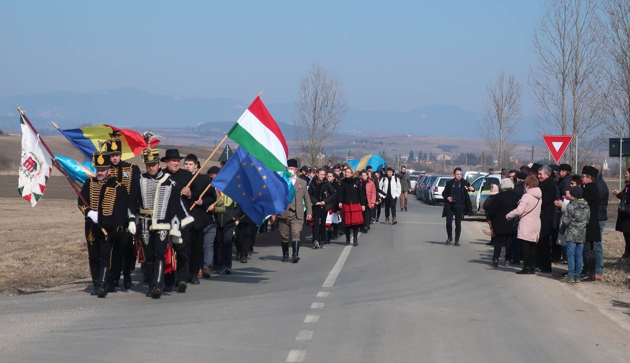 Fiatalok hozták a nagyméretű székely zászlót a véczeri keresztúthoz. Az emlékezők tapssal fogadták őket, csakúgy az érkező köpecieket, ürmösieket, felsőrákosiakat, székelyszáldobosiakat és másokat is.