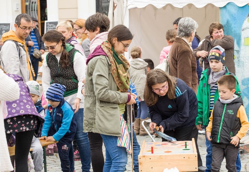 Gyereknapon sem szokott annyi apróság lenni a főtéren, mint e két napon, ami annak is köszönhető, hogy három nagy sátorban is az ő szórakoztatásuk volt a fő célja a felnőtteknek: a Caritas sátrában több mint tízféle hagyományos játékot próbálhattak ki, és ha ügyeskedtek, gombot nyertek. Öt gomb pedig már „keményvalutára” volt beváltható, azaz vásári garasra, ügyesen tenyérbesimuló kis cserépkorongra. A Míves Ház sátrában ősztündérrel, gyapjúkötélfonással, karmantyúszövéssel vagy bogozással lehetett megszolgálni a garast, a mézes sátorban pedig az Ispiláng Egyesület munkatársainak instrukcióival csuhévirág, papírcsiga készült, ezenkívül Demeter Évának is volt számos ötlete az aprók és a még apróbbak lekötésére. A sok-sok gyerek több órai munkát áldozott arra, hogy garasait a vásári boltban könyvre, mézre, trikóra, vagy varrott zöldségekre beváltsa. Vasárnap délután már erősen megcsappant a készlet, ugyanis ilyen szorgos társaságra senki nem számított. Persze, vigasztalódhattak az utolsó játékosok – a hétéves Timofte Cristian három órát szövögette karmantyúját –, mert „ha nem jut portéka, maradnak az általuk készítette tárggyal s a tudással”, mondta Benkő Éva.