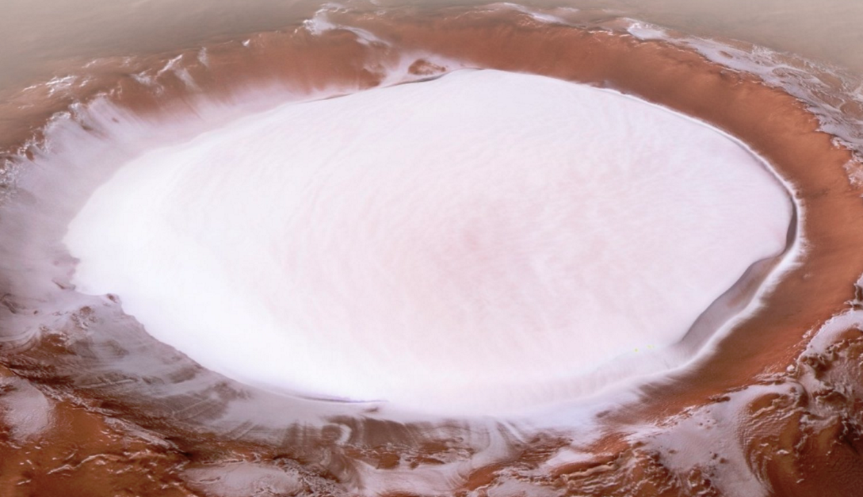 Az Európai Űrügynökség (ESA) képe a Mars Express Orbiter űrszonda öt fotójának felhasználásával készült el – írja az IFLScience. A felvételen a fagyott vízzel teli Koroljov-kráter látható.