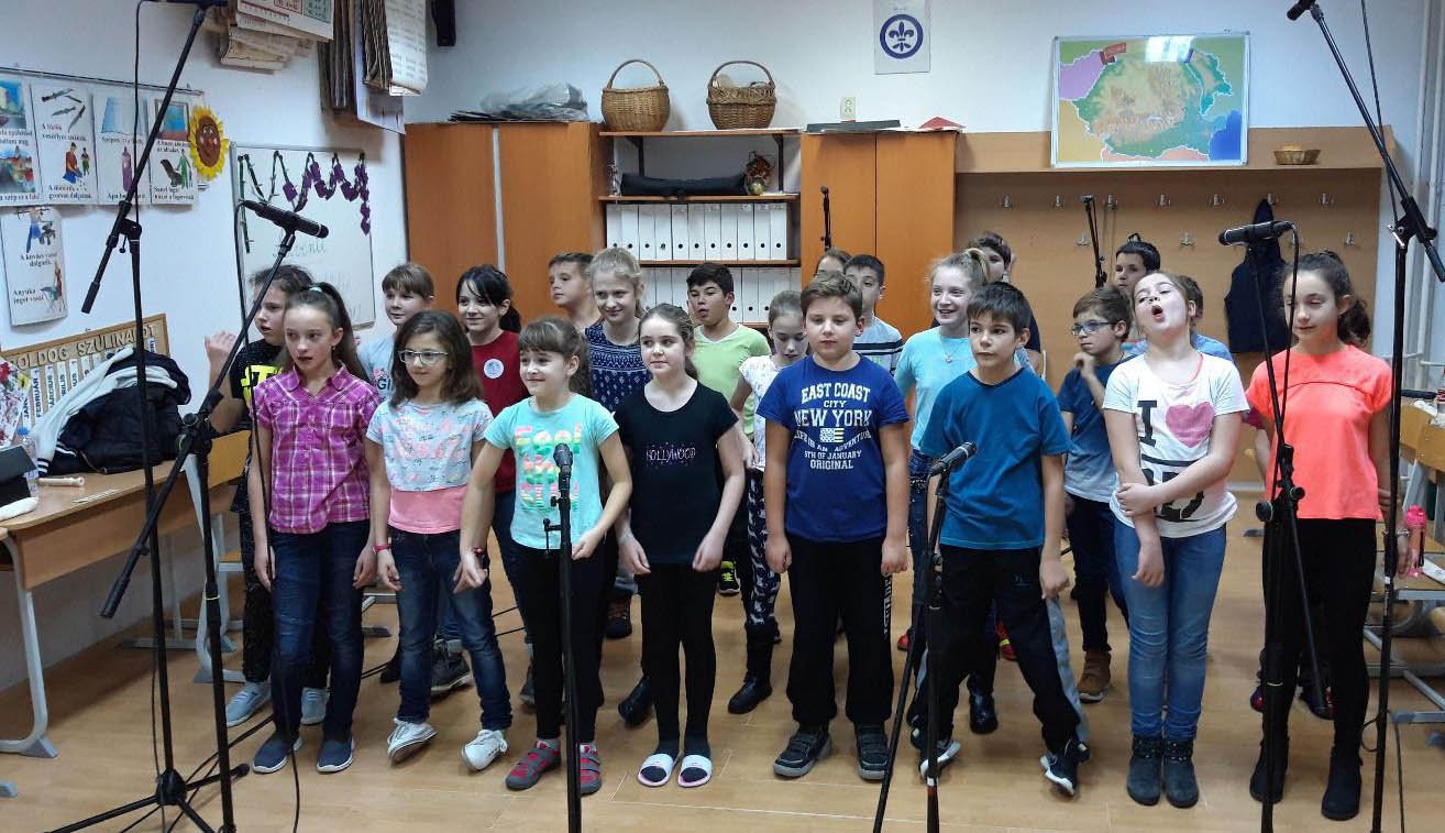 – Az osztálytermet rendeztük be stúdiónak, sok mikrofonnal, kábellel, egy csomó felszereléssel. Nagyon hálás vagyok Tofán Levente szülőnek, hogy segített a szervezésben és Szabó István sepsiszentgyörgyi zenész-technikusnak, hogy a felvételeket elkészítette, dolgozott a felvett zenei anyaggal, hisz nagyon sok utómunka van egy ilyen nyersanyaggal. Két délután tudtuk a zenei anyagot rögzíteni, nagyon koncentrált, fegyelmezett, izgalmas munka volt. A gyerekek hozzáállása, igyekezete, teljesítménye példaértékű volt – dicsérte tanítványait a tanítónő.