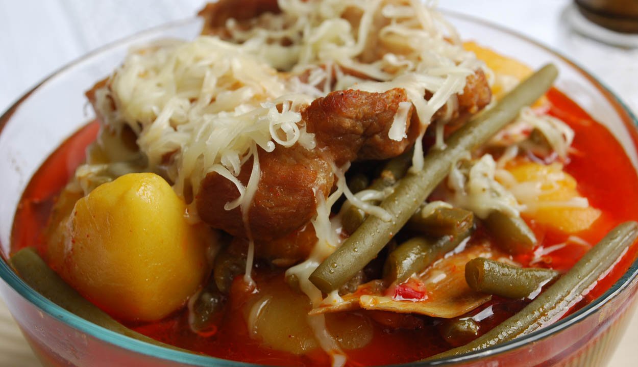 Hozzávalók: 500 g bárányhús, 4–5 krumpli, 4 paradicsom, 3–4 fej hagyma; 1 pohár zöldpaszuly, 2 zöldpaprika, 1 pohár zöldfűszer (bazsalikom, korianderlevél, kapor, borsfű), 1/2 kávéskanál őrölt fekete bors, 3/4 pohár aszalt barack.