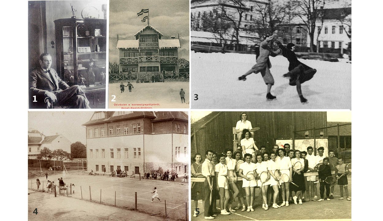 | 1.kép: 1. A Mikó Kollégium tornászcsapatának felvonulása a Csömöri úti stadionban a középiskolák 1905-ben rendezett országos versenyén 2. A Mikó győztes tornászcsapata az elnyert vándorzászlóval 3. Tornabemutató a kollégium udvarán 1927-ben 4. Sztoján Aurélnak a kollégium atlétikaversenyén elért helyezéseiért kapott diplomája | 2.kép: 1. Péter László atlétikaversenyeken nyert érmeivel és kupáival 2. A szövőgyár mellett épült korcsolyapálya és öltözője 1899-ben 3. Benedek Tivadar, a polgári fiúiskola igazgatója és lánya a Mikó épületével átellenben létesített pályán 4. Teniszmérkőzés a mai Kós Károly Iskola épülete mögötti pályán 5. Sepsiszentgyörgy legjobb teniszezőinek csoportképe 1960-ból |