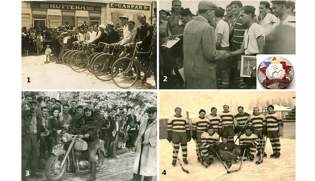 | 3.kép: 1. Kerékpárverseny startja 1928-ban 2. A Munkára, Harcra Kész (GMA) elnevezésű tömegsport-verseny győzteseinek díjazása az 1950-es években (a kép sarkában a mozgalom jelvénye) 3. Gáspár Gyula, az 1957-ben rendezett, tömbház körüli verseny győztese 4. Sepsiszentgyörgy jégkorongcsapata az 1950-es években | 4.kép: 1. A Munkás Testnevelő Egyesület labdarúgó-csapata 1942-ben 2. A városi stadion avatóünnepségén 1958-ban, a helyi Textil a kisinyói Burevesztnyik együttesével mérkőzött 3. A Textil 1946 júniusában egy angol katonai missziós csapatot győzött le 6-1arányban 4. A Textil labdarúgó-csapata és vezetősége 1947-ben az első osztályba való feljutás alkalmából készült tablón |