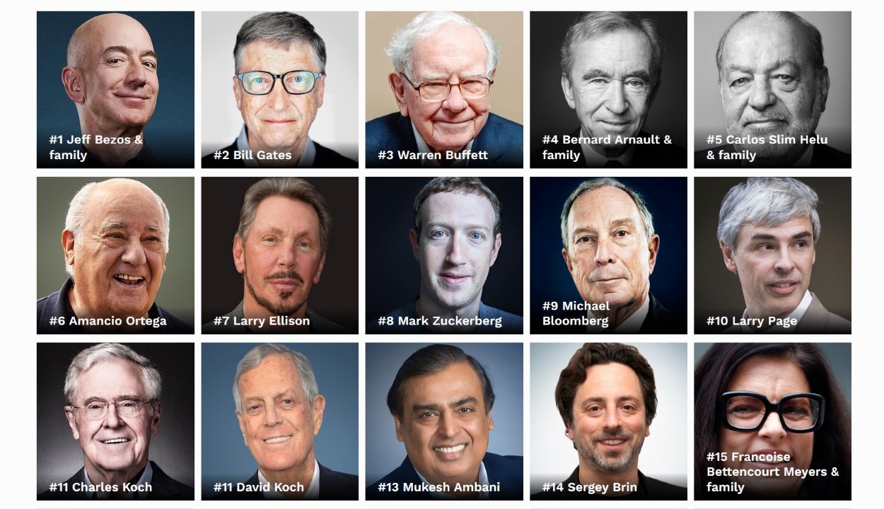 A Forbes szerint a világ leggazdagabb embere Jeff Bezos, az Amazon vezére 131 milliárd dollárral. A második Bill Gates, a Microsoft alapítója 96,5 milliárd dollárral, a harmadik pedig a sztárbefektető Warren Buffet, aki 82,5 milliárd dollár fölött rendelkezik.