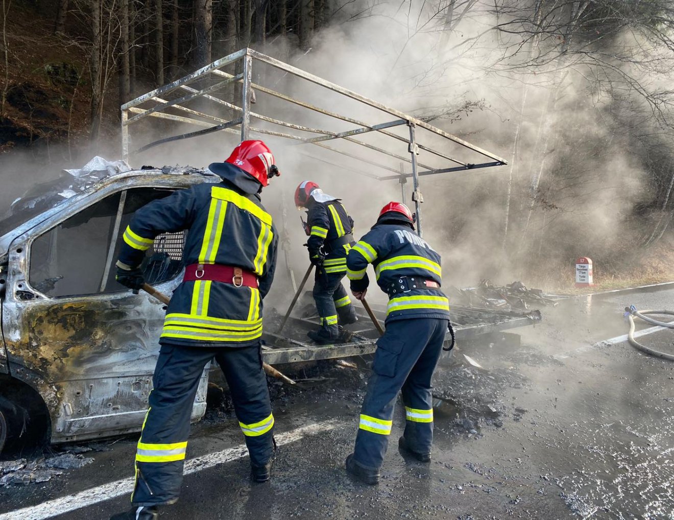 Néhány perccel később a 112-es segélyhívó számon érkezett bejelentés, hogy Torja és Bálványos között kigyulladt egy furgon. A tűzoltók két járművel szálltak ki a helyszínre, ahol megállapították, hogy a lángok a teljes, bútorokkal megrakott járművet felemésztették. Az incidens nyomán senki sem sérült meg, vagy szenvedett füstmérgezést, a tűz csak anyagi károkat okozott.
