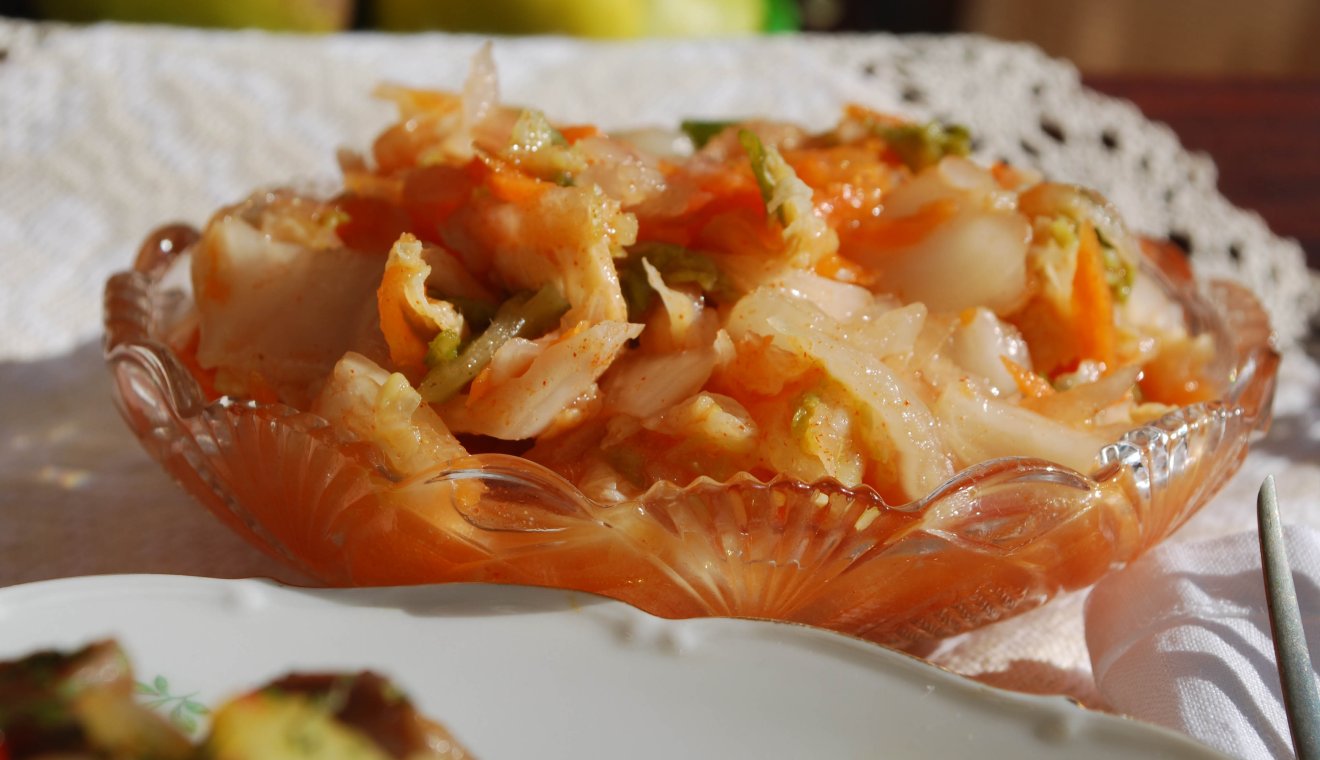 Jelzem, C-vitamint nem csak a gyógyszertárban lehet szerezni, jó lelőhely a pincei polc is, ahol egyöntetűen hecserlilekvárt is és kimchit is lehet találni (mint már említettem, igencsak nemzetközi hely az). A kimchire csak nemrég kaptam rá, de olyan mértékben, hogy naponta fogyasztom, akár magára is. A hozzávalókhoz sem kell Koreáig szaladni, még egy ilyen kisvárosban is megtalálható minden, természetesen az egyszerűbb változathoz (amiből kihagyjuk a gochugarut vagy a kombut).